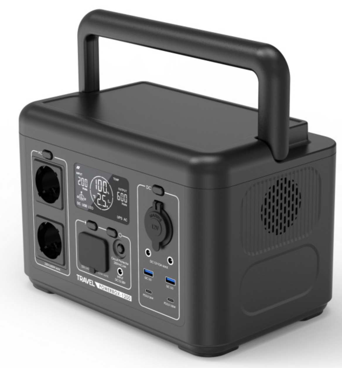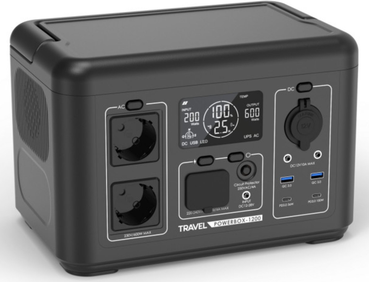 TRAVEL POWERBOX 1200 (600W) została wyposażona w nowoczesny akumulator LiFePO4 (litowo-żelazowo-fosforanowy) o pojemności 512Wh, który wyróżnia się wbudowanym systemem zarządzania BMS, dużą ilością cykli (do 3000 cykli) oraz niską wagą. Dzięki dużej liczbie cykli i bardzo niskiemu samorozładowaniu akumulator LiFePO4 doskonale sprawdza się jako niezawodne źródło energii w stacjach zasilania.